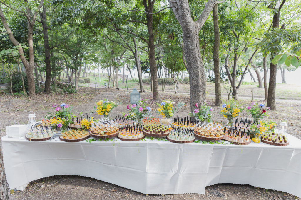 外でわいわい楽しく会食したい、という方には、ビュッフェスタイルがおすすめです。屋外でのウェディングは、自然の美しい景色を最大限に活かすことで、華やかなお写真を残せることはもちろん、リラックスした雰囲気を演出します。