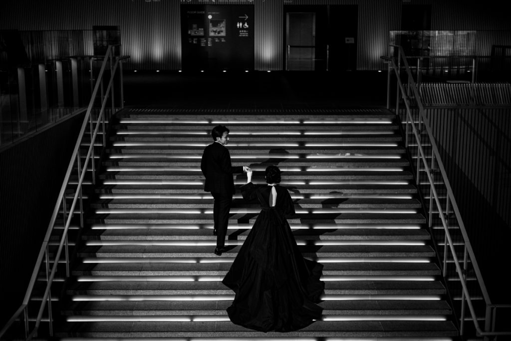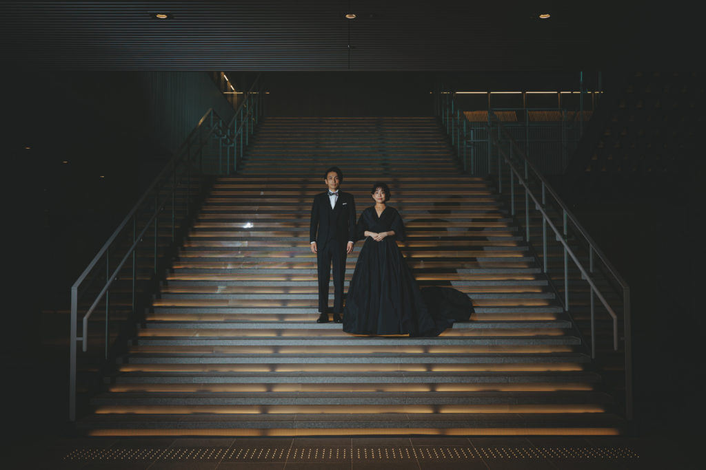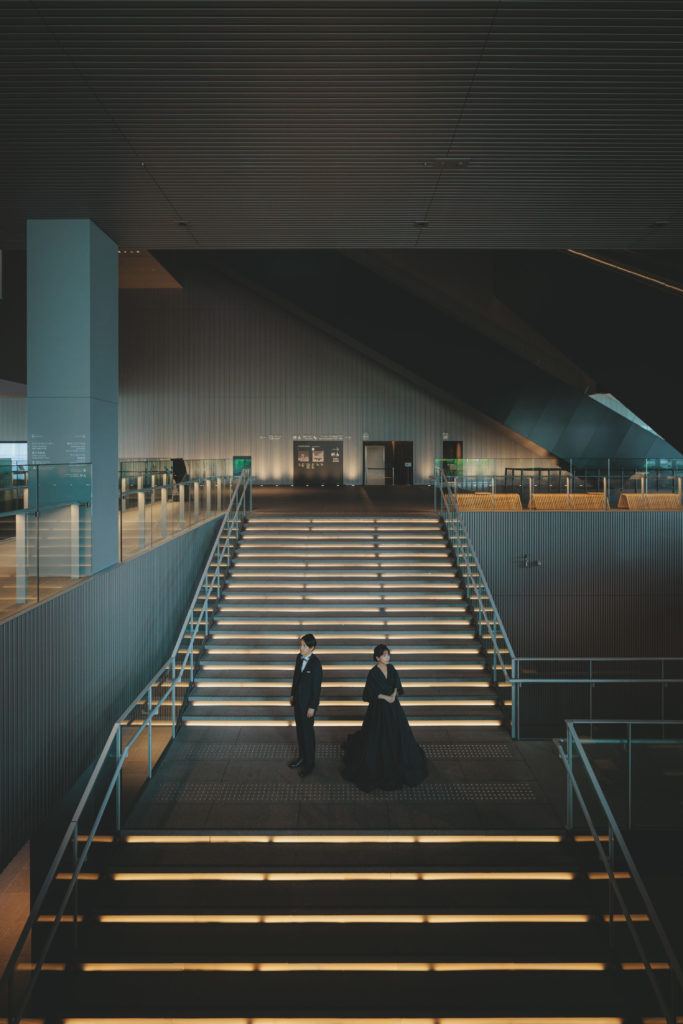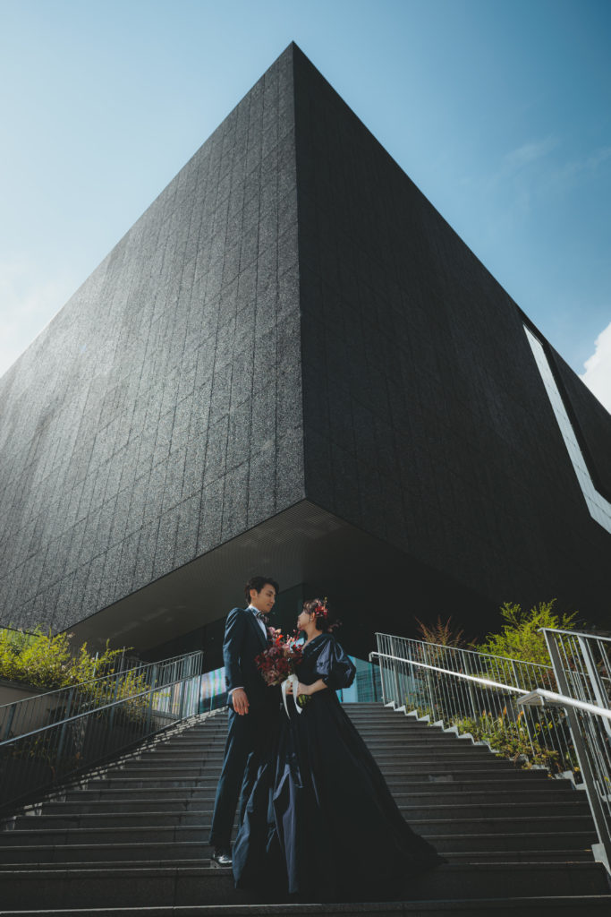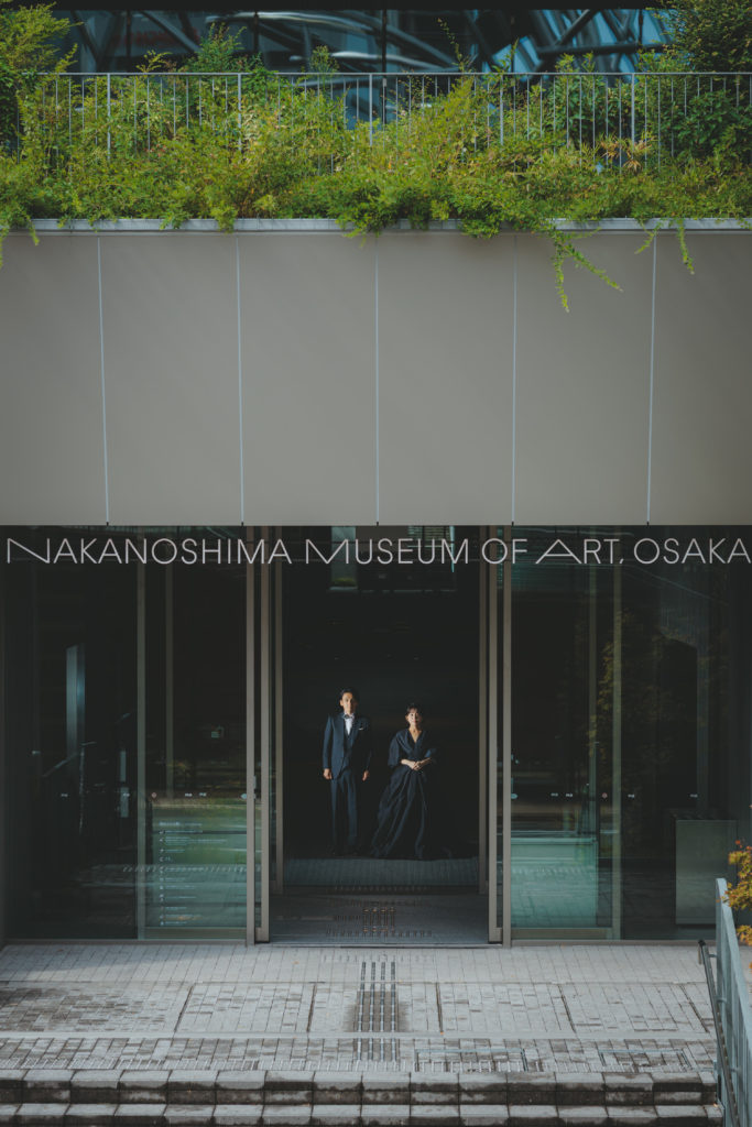 撮影に向けてお選びいただいた、ドレスとタキシードに身を包み、中之島美術館から撮影スタートです。