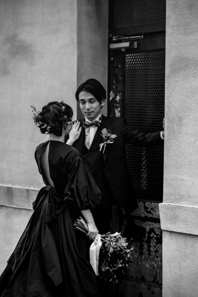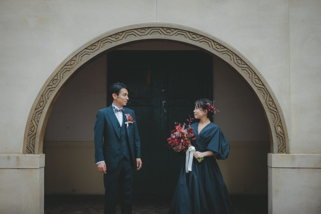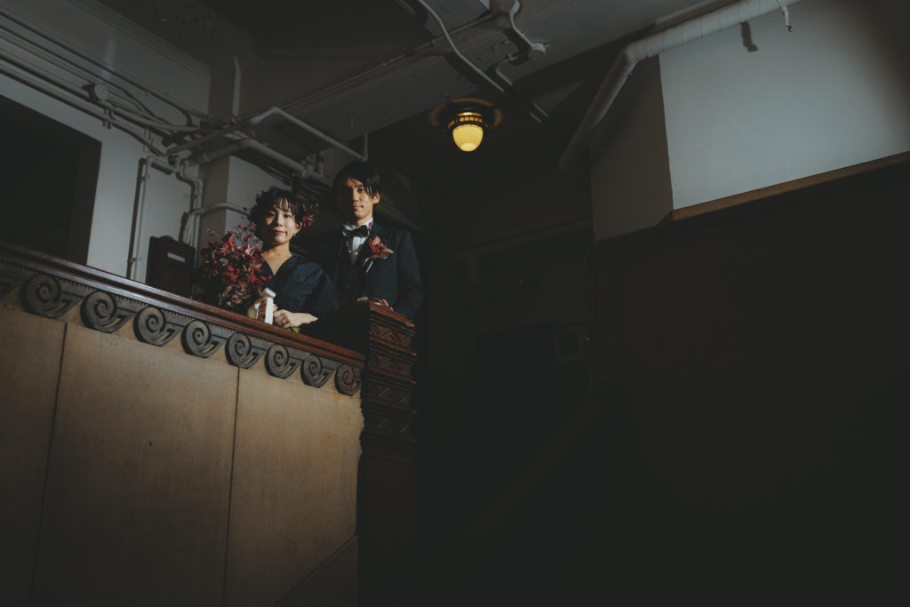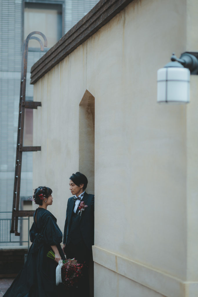 屋上のテラスでは、重厚な建物と石造りの壁の重厚さがおふたりの姿に溶け込んでいました。