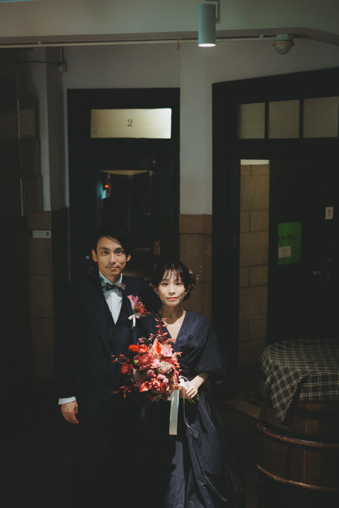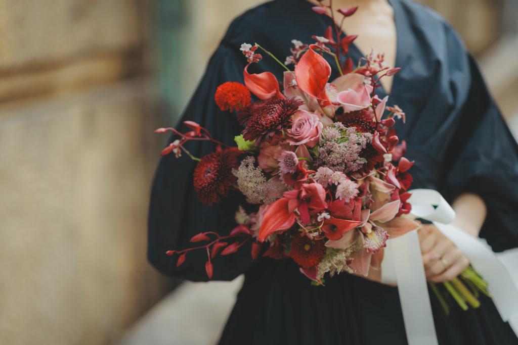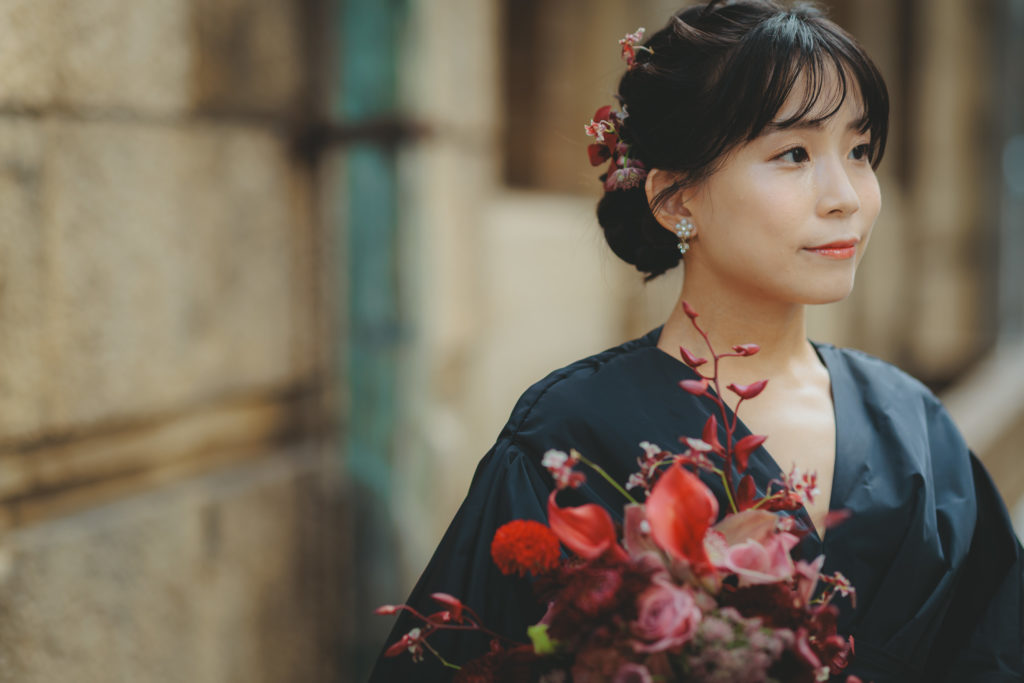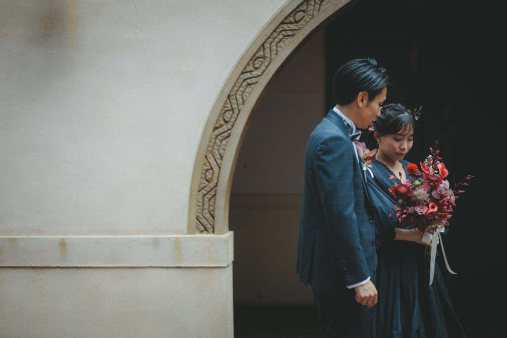 ブーケとヘアアクセサリーの深い赤色と石造りの重厚感がとても素敵でした。