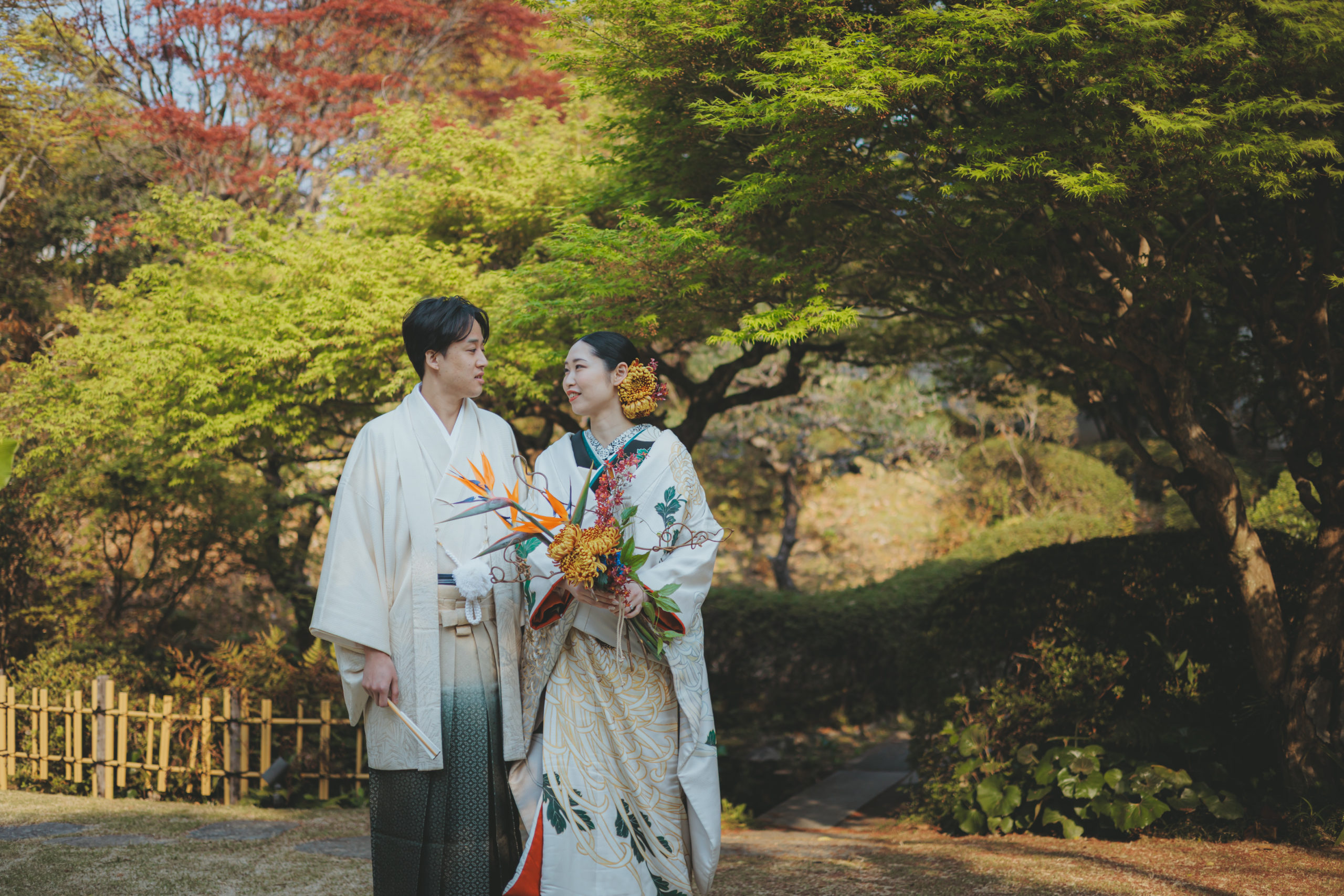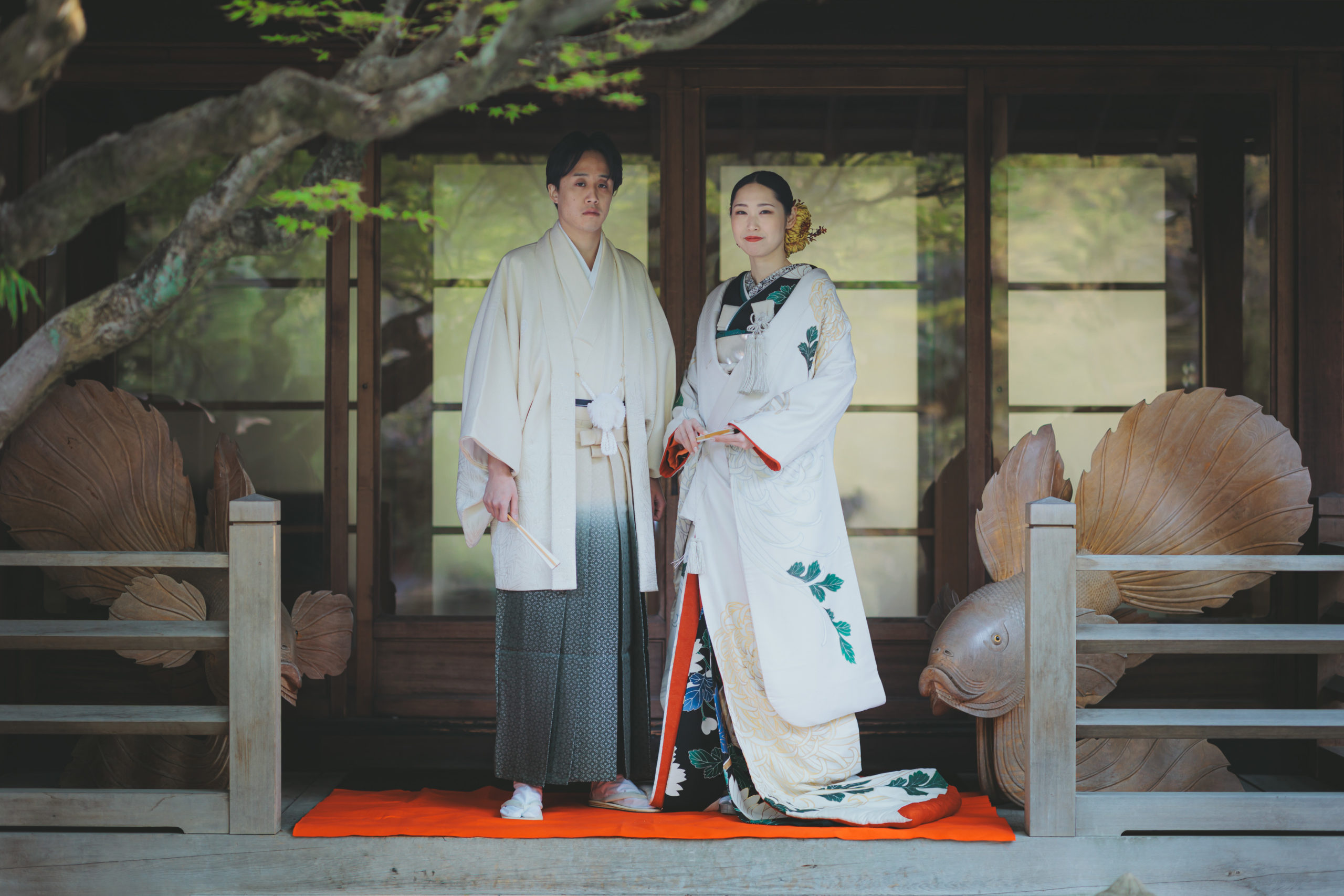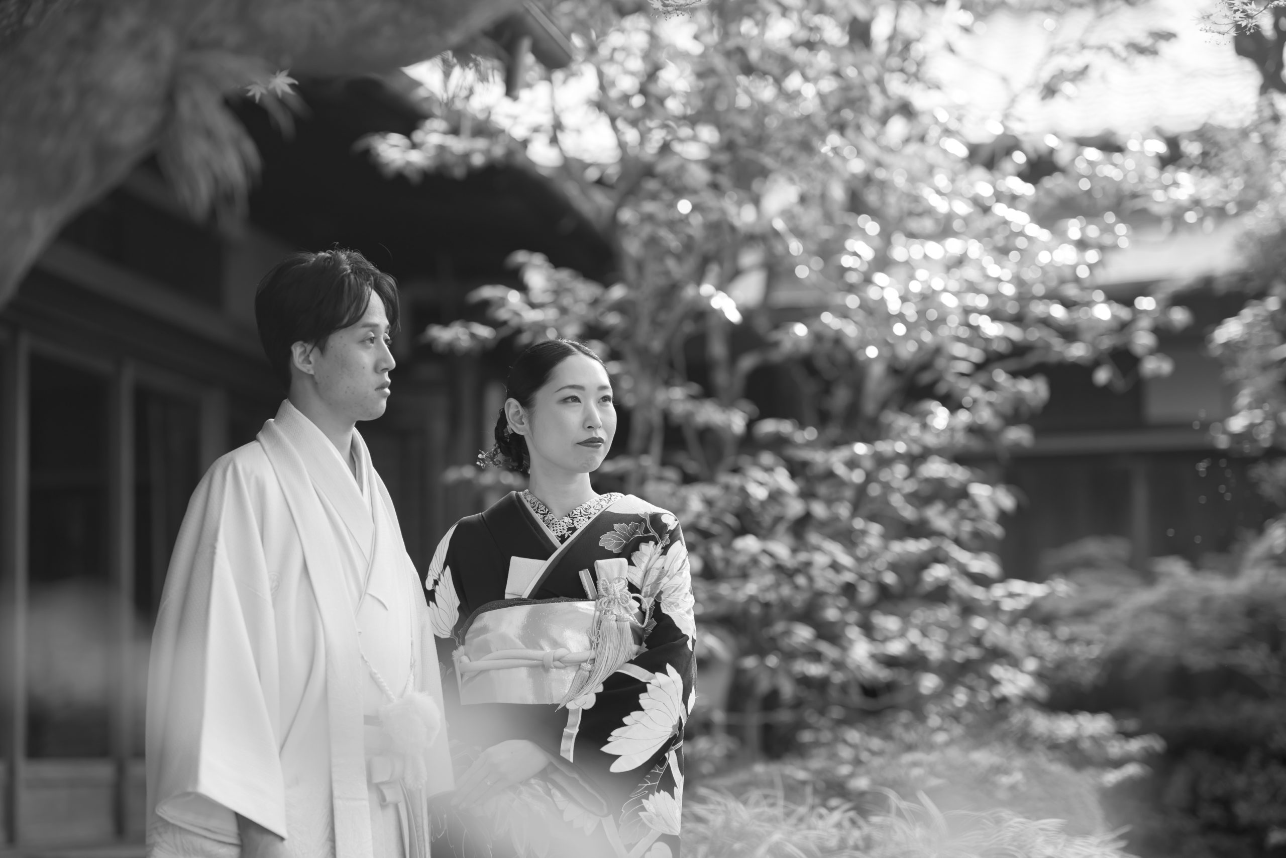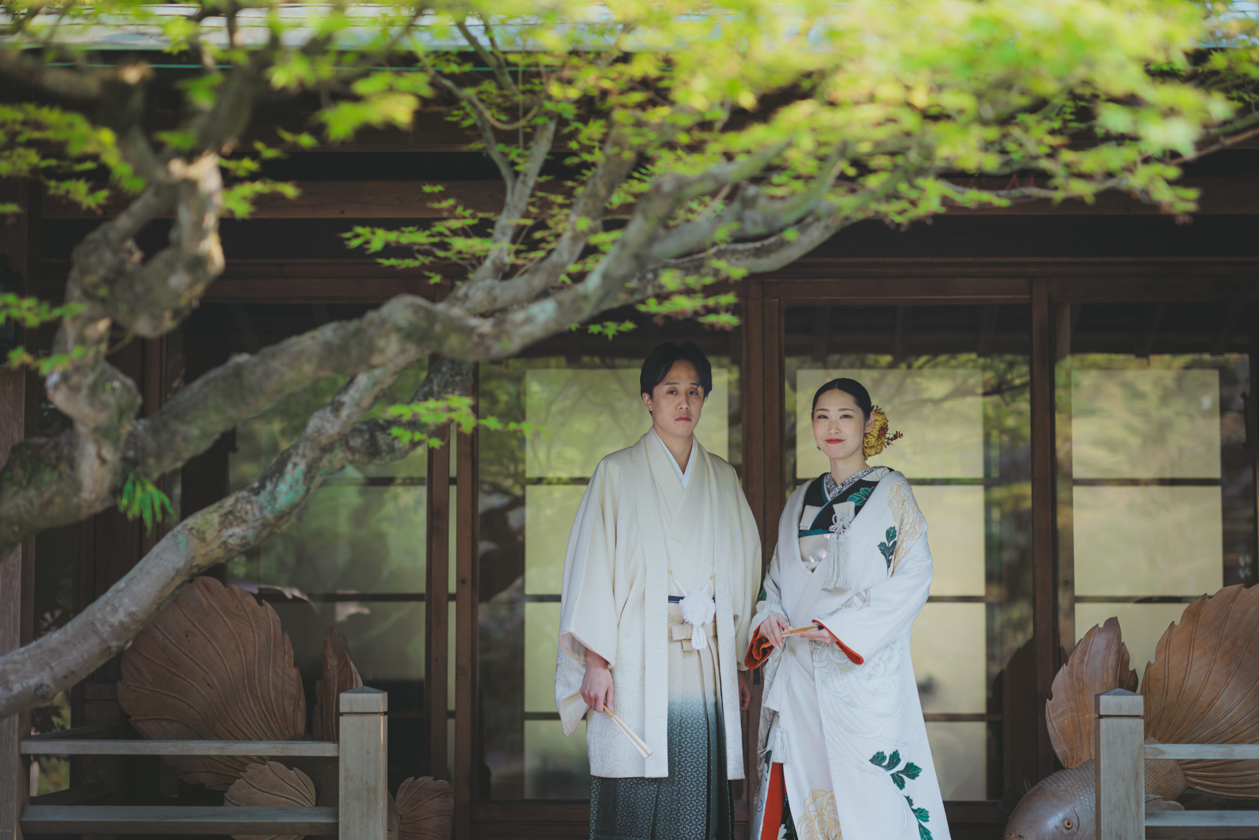 白無垢や色打掛の和装が、緑と建築に映え、上質で凛とした雰囲気の中、おふたりの姿を写真に残します。