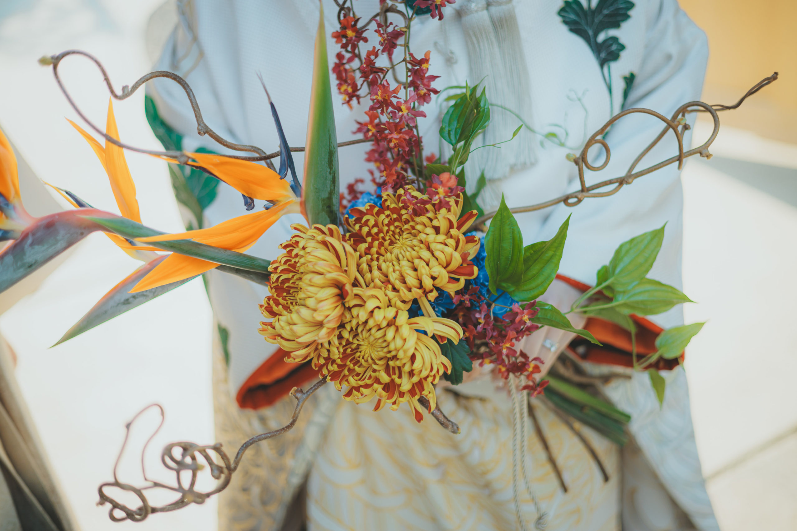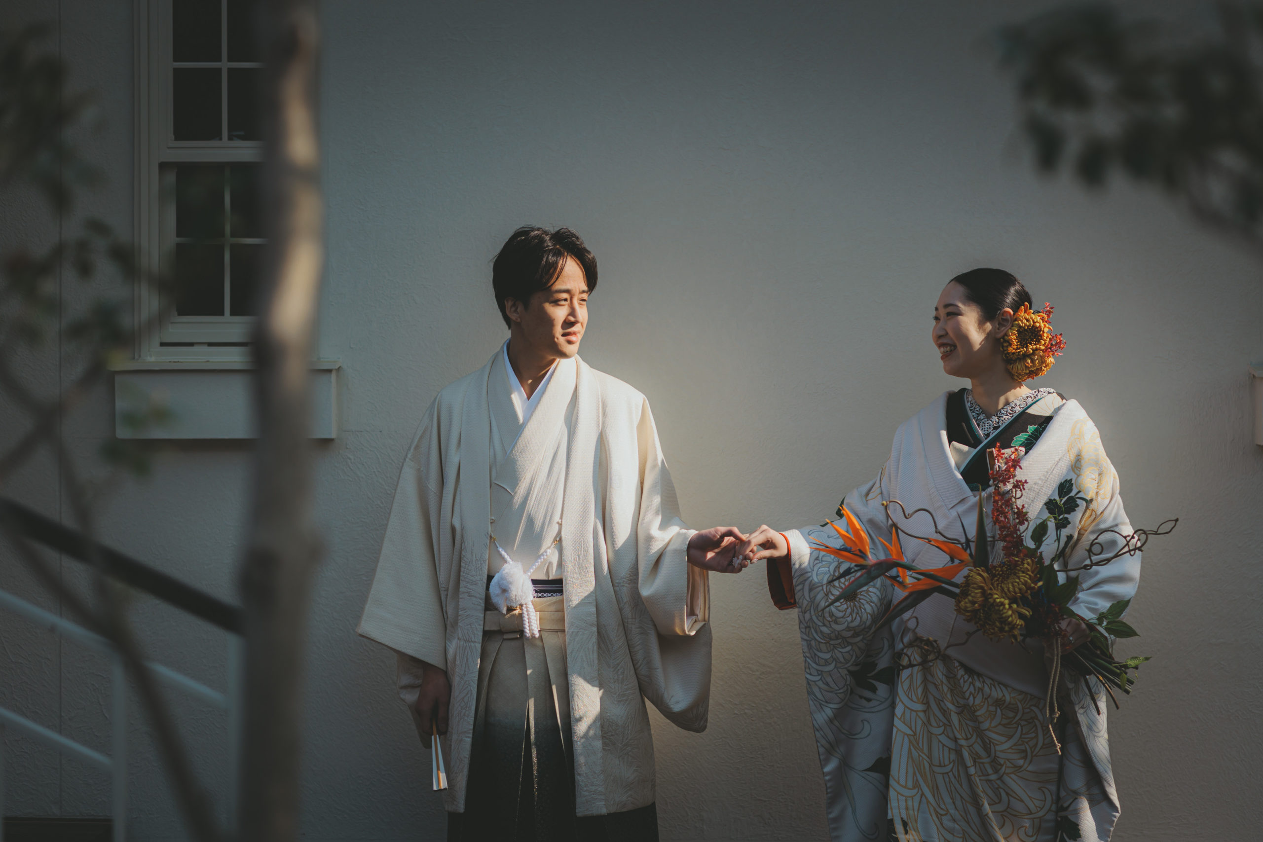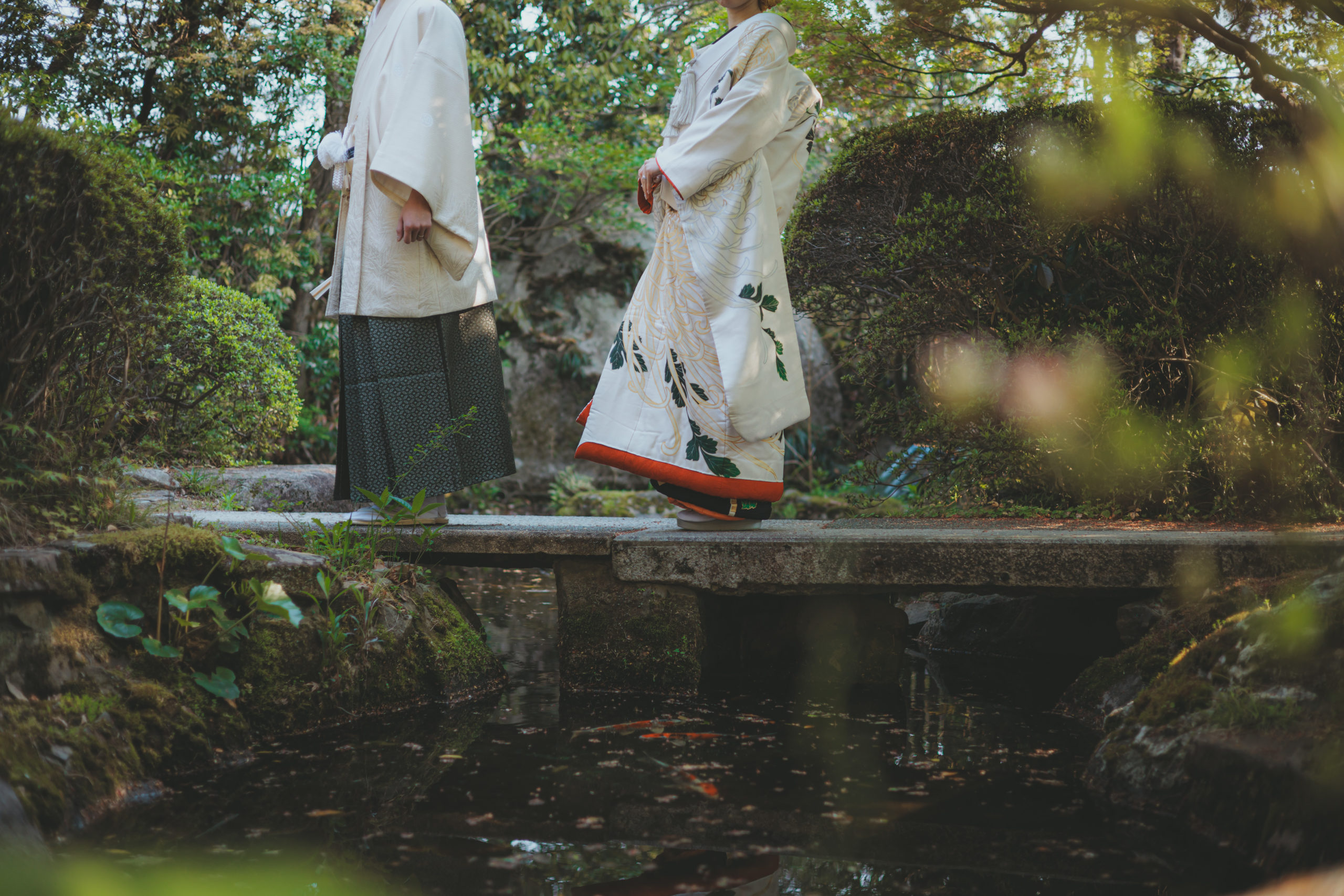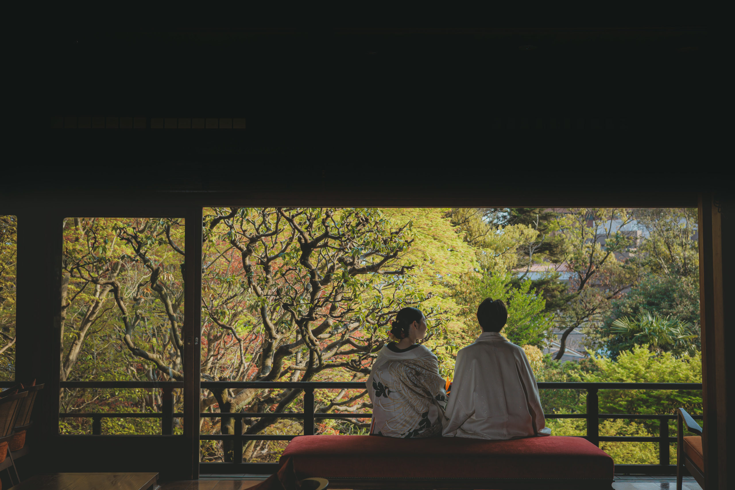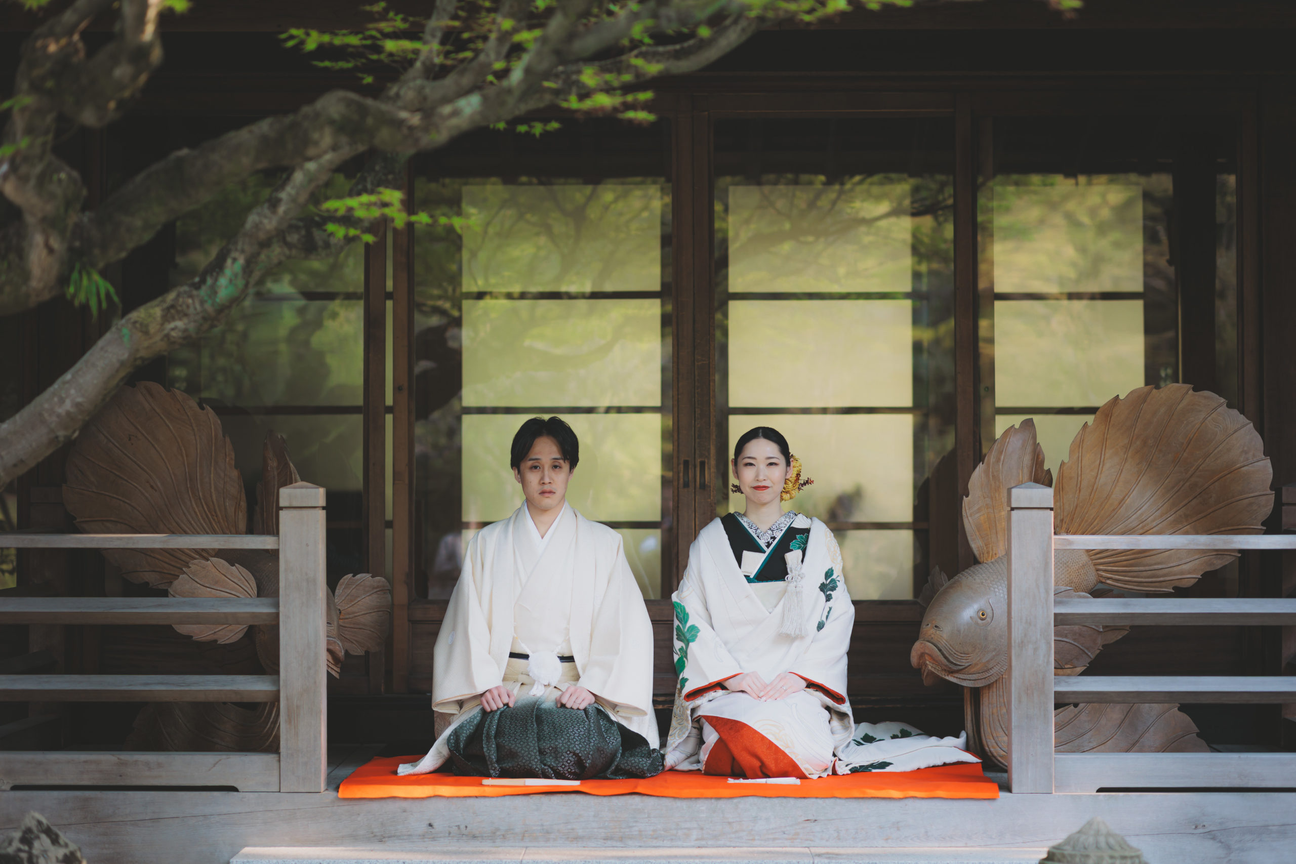 白無垢や色打掛の和装が、緑と建築に映え、上質で凛とした雰囲気の中、おふたりの姿を写真に残します。